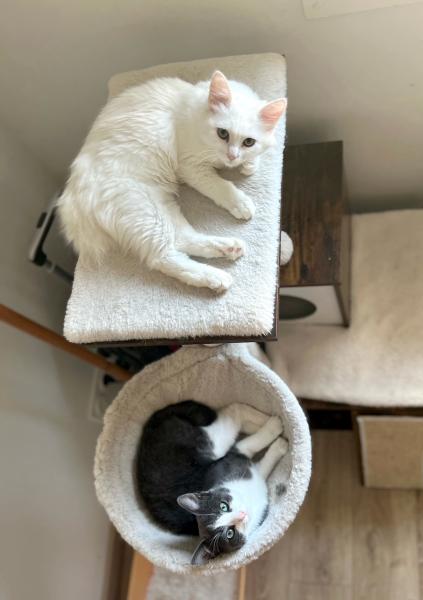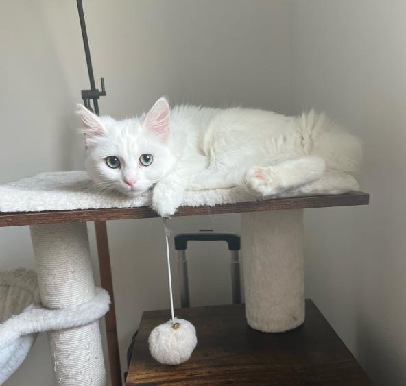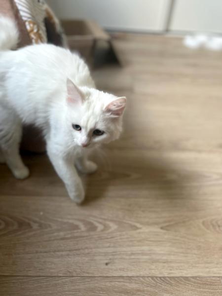 Vaï, petite femelle blanche à poil long, est d’une douceur sans nom, mais il faudra gagner sa confiance avant de pouvoir la caresser. Méfiante, elle a besoin d’adoptants patients, qui ne forceront pas le contact et sauront l’amadouer à coup de friandise, respect et quelques petites grattouilles derrière l’oreille une fois qu’elle aura donné sa permission. Elle adore faire la sieste dans les recoins les plus improbables. Ne soyez donc pas surpris de la retrouver en train de somnoler la tête dans une chaussure, en haut d’un placard ou derrière la télé.