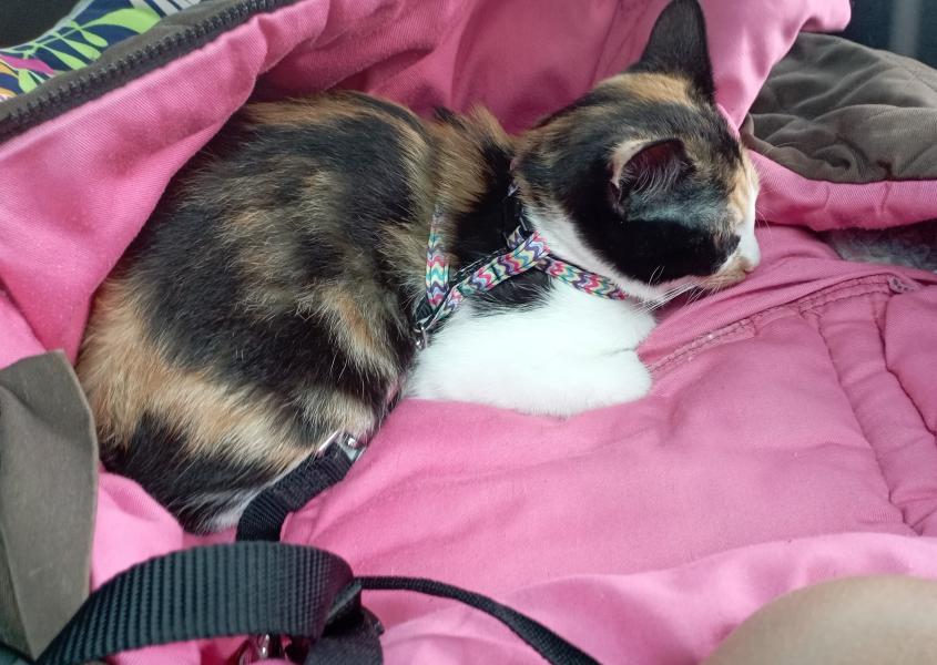 Elle aime sortir prendre l’air dans le jardin et y lézarder. L’apprentissage du harnais et de la laisse est en cours.