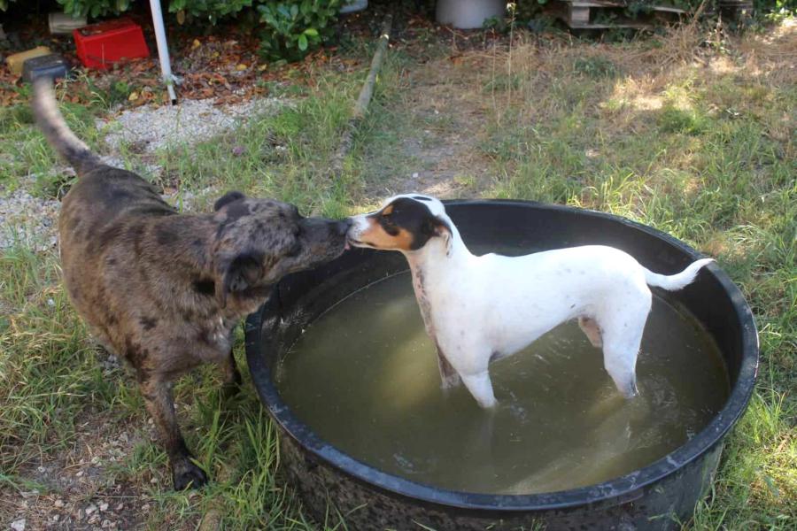 Bien qu’elle ait vécu ses six premières années seule avec ses maîtres, elle adore la compagnie de ses congénères. Un placement avec un ou plusieurs copains sera privilégié. Elle aime suivre les copains dans l’eau et jouer avec eux.