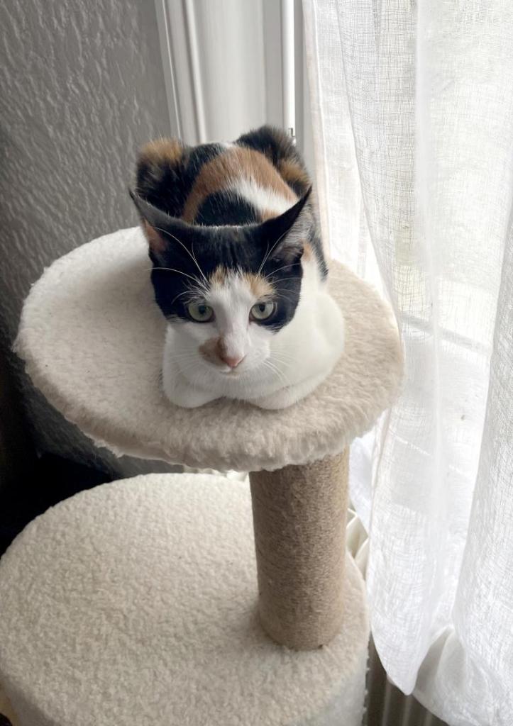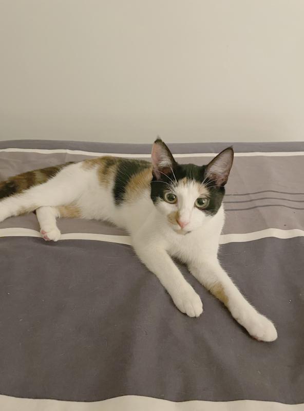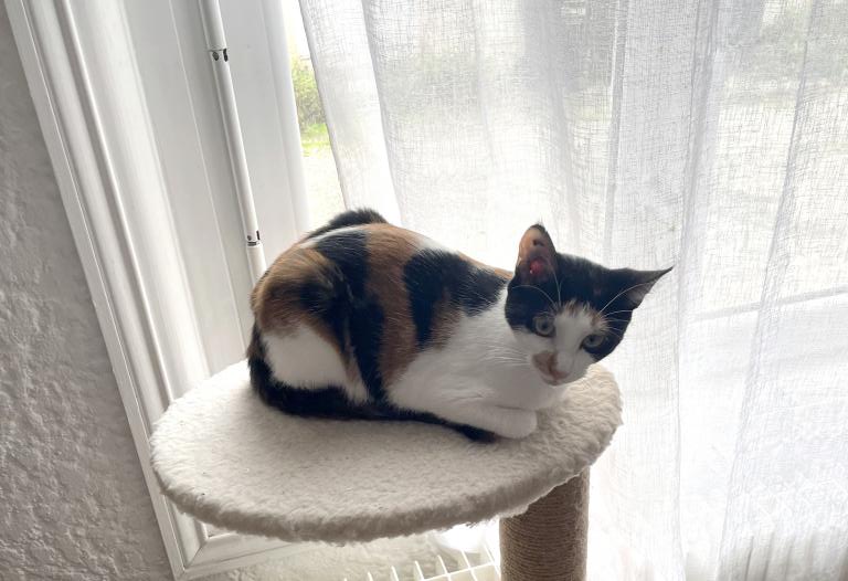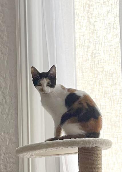 Vahity est une chatonne joueuse et très curieuse qui adore regarder la télé. Elle aime observer ce qui se passe dehors perchée sur son arbre à chat.
