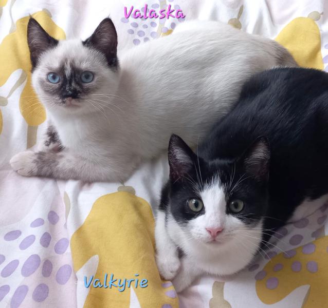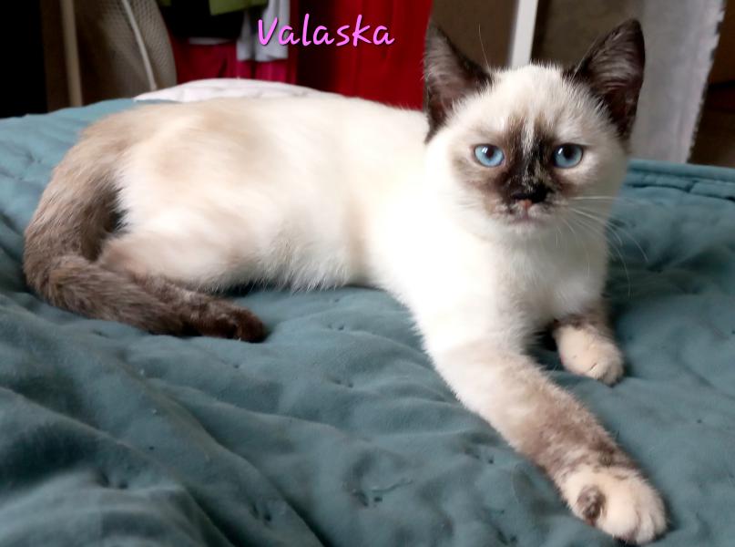 Sa sœur, Valaska, belle et douce siamoise aux yeux saphir, est une adorable chatonne joueuse et câline qui suit son frère partout pour des séances de jeux et de câlins. Légèrement craintive quand elle ne connait pas, elle adore les caresses et ronronne fort pour en re-demander.