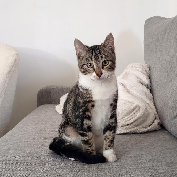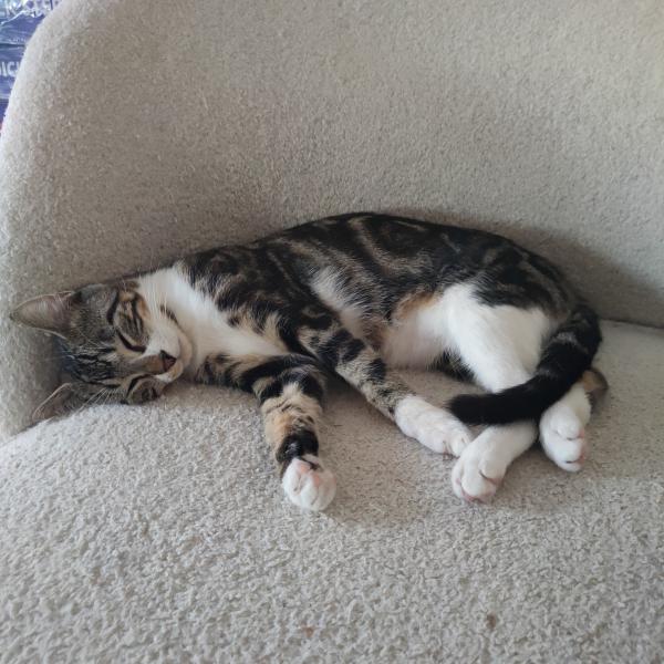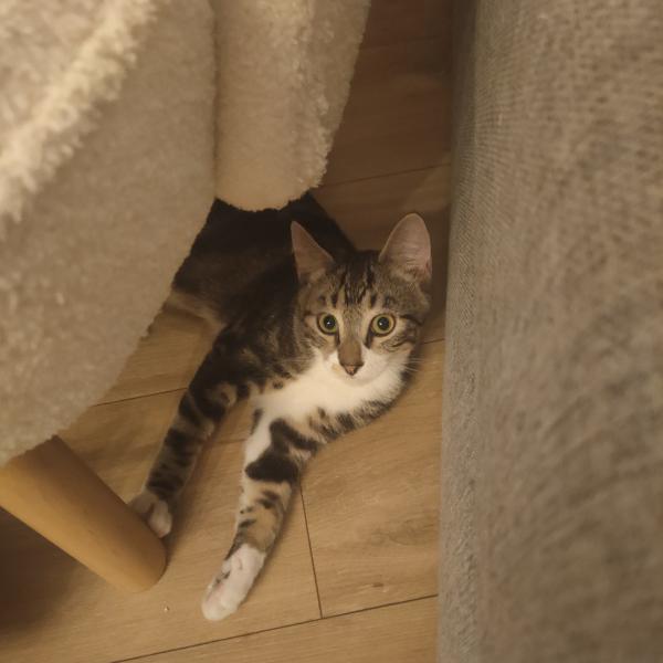 Valdor est un chaton encore peureux mais qui en même temps adore suivre sa nounou partout. Il dort toutes les nuits au bout du lit.