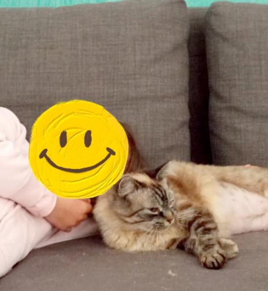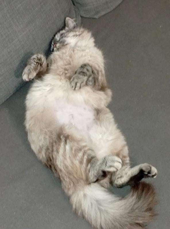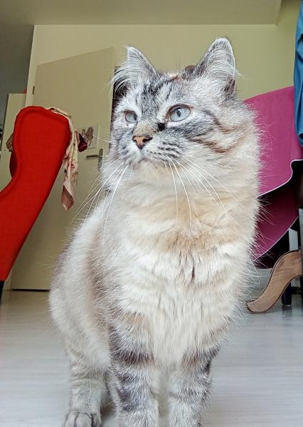 Elle peut se montrer bavarde et sait très bien se faire comprendre. Elle a de petits moments de jeu, mais préfère de loin siester sur le canapé ou le lit.