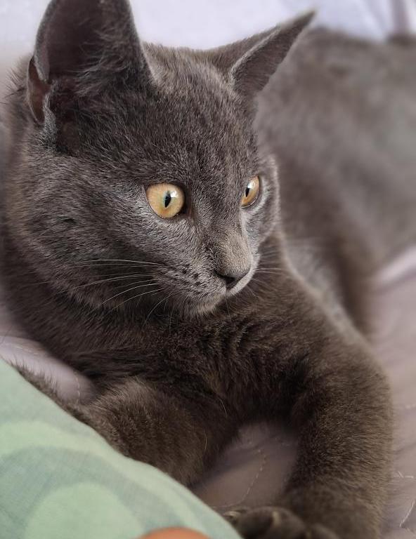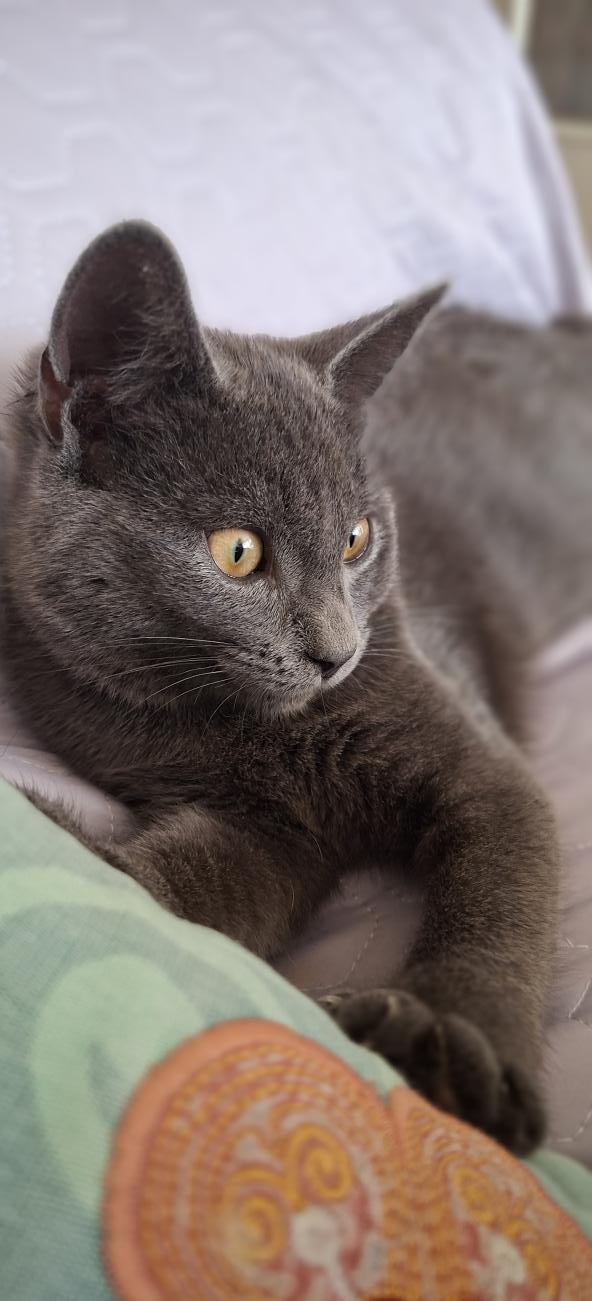 Augusta est une très belle chatonne typée chartreux aux yeux ambre-orangé.