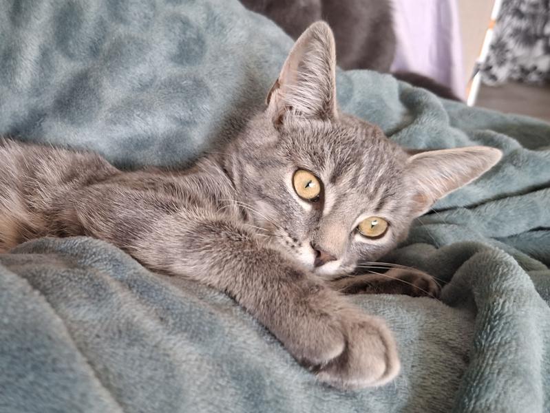 Augustine est une très belle chatonne à la douce fourrure marbrée et aux yeux dorés. Elle adore les séances de caresses et ronronne avec bonheur.