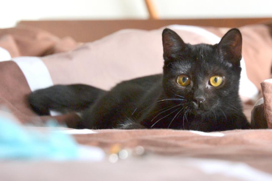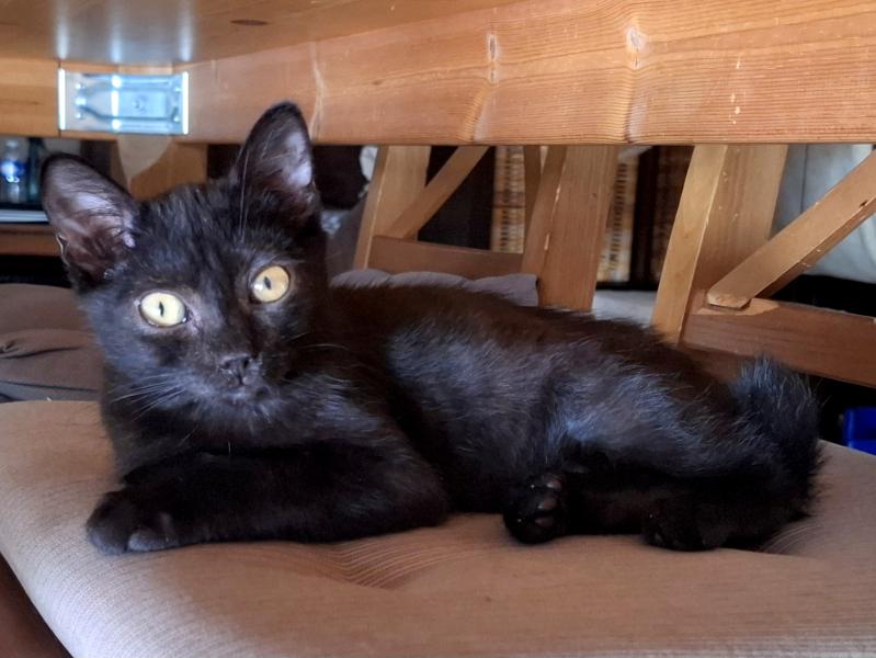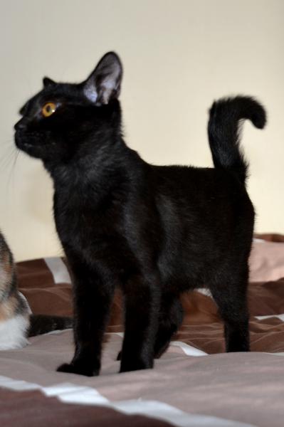Ariane est une chatonne de petit gabarit, avec de grands yeux dorés et une petite queue en tire-bouchon. Elle aime les câlins, suivre sa famille d’accueil partout et se poser sur les genoux ou le torse. Sociable, elle n’a pas peur de grand chose. Elle est également gourmande.
