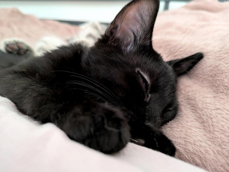 Ariel une grande chatonne très timide qui aura besoin de temps pour prendre ses marques et faire confiance. Après l’adoption de son frère, elle s’est rapprochée de sa famille d’accueil et s’est révélée câline. Elle ronronne de bon coeur et adore patouner. Elle dort chaque nuit avec sa nounou Luana. Elle s’est même habituée petit à petit aux amis deLuana.
