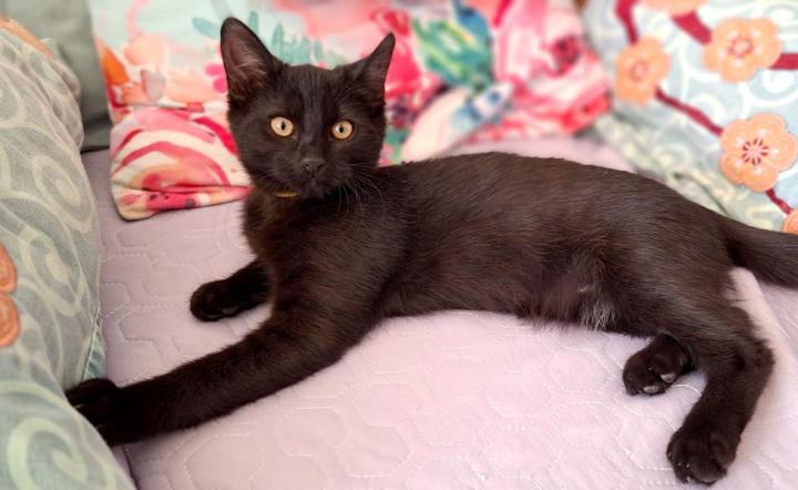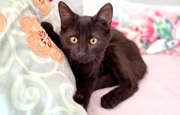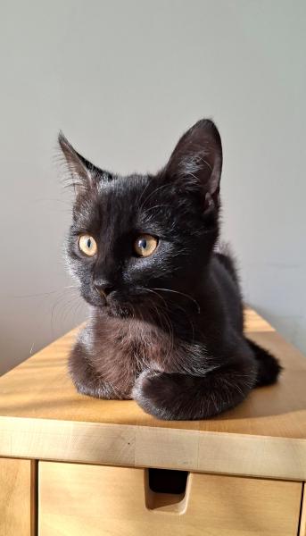 Anoukis est un très beau chaton au pelage noir brillant et aux yeux ambrés, tout gentil et câlin. Il aime les petites siestes sur le canapé contre son humain et ronronne volontiers contre des caresses.