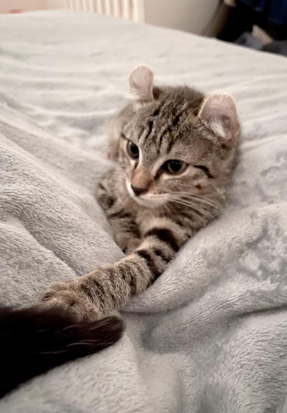 Il a pour vous séduire deux atouts charme indéniables: de belles petites oreilles courbées façon american curl et une petite queue en tire-bouchon qui font de lui un chaton à croquer.