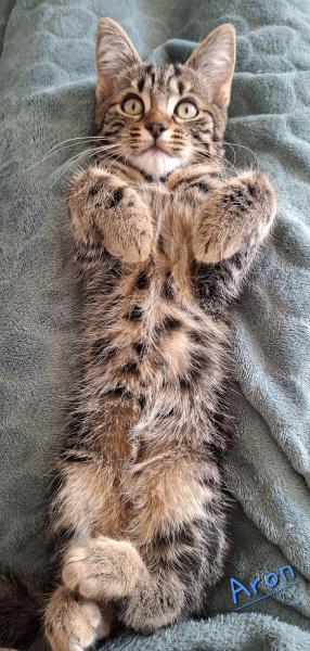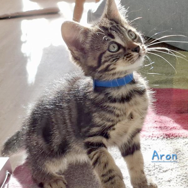 Aron – alias Monsieur adorable-petit-trésor – est un chaton extrêmement affectueux, toujours de bonne humeur et heureux ; c’est la joie de vivre au quotidien.