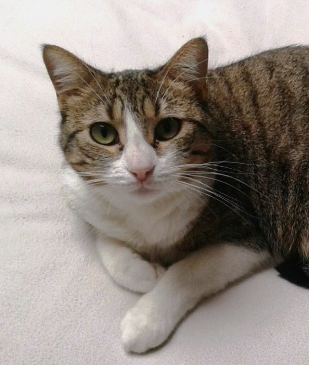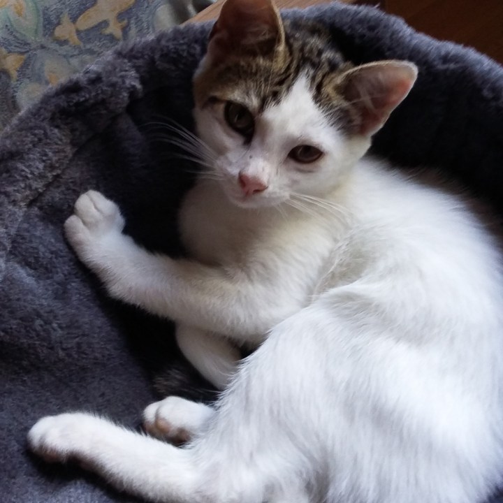 Une adorable petite chatte blanche avec un peu de tigré posé comme un chapeau sur la tête 🙂 Continuer de lire Mattie jolie (adoptée, février 2017)